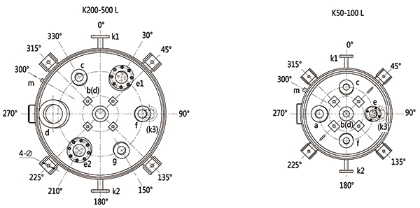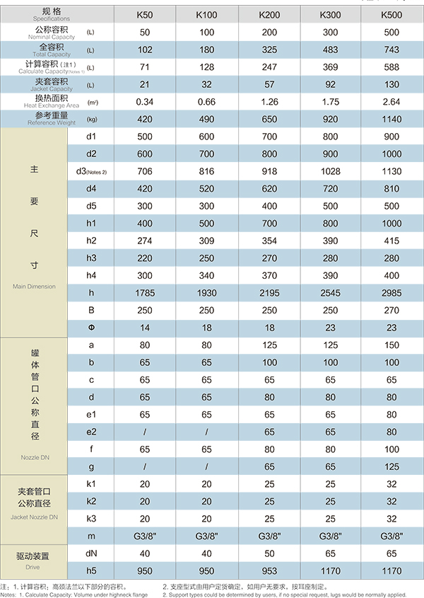 K50L-K500L開式搪玻璃反應釜(開式搪瓷反應釜)設計圖紙及參數如下所示: