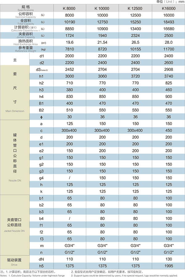 K8000L-K16000L開式搪玻璃反應釜(開式搪瓷反應釜)設計圖紙及參數如下所示:
