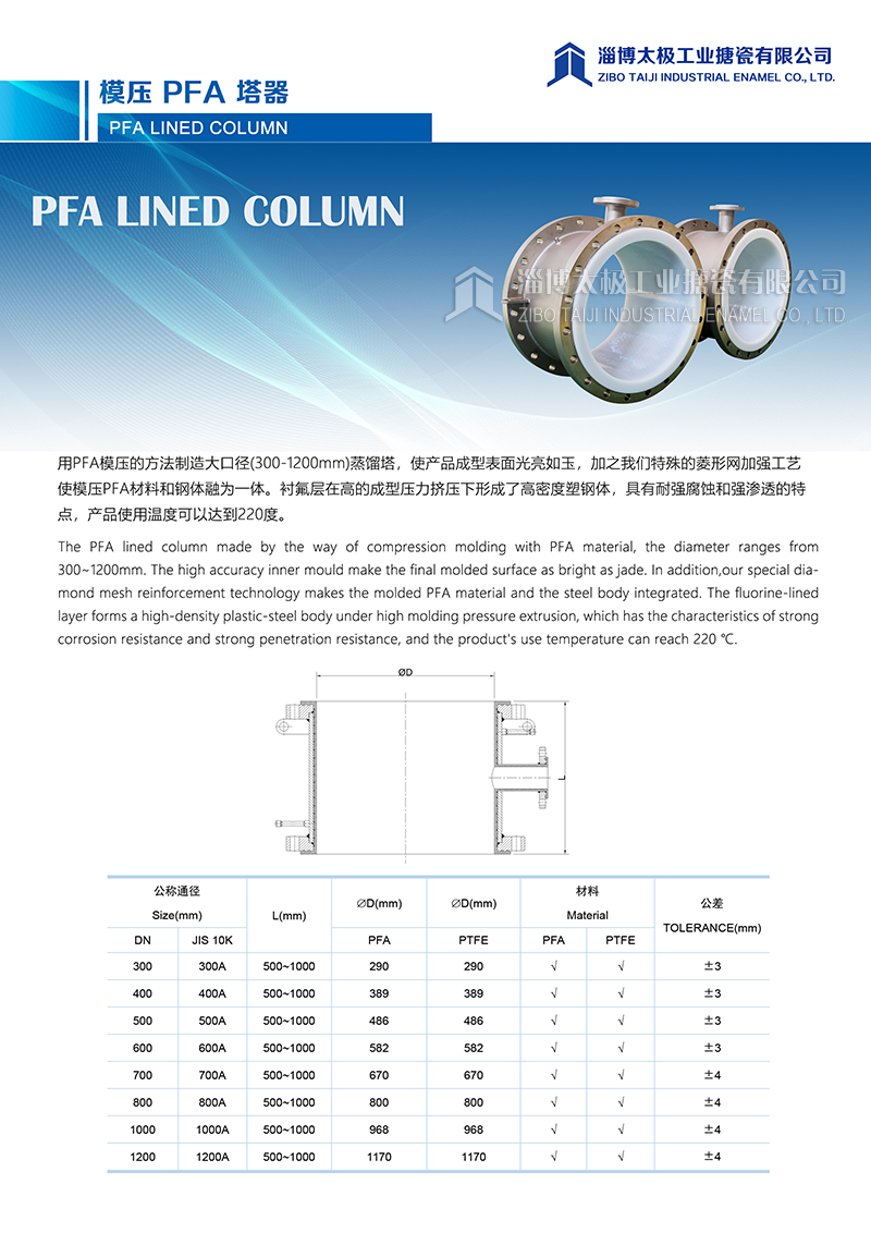 模壓PFA塔器 PFA LINED COLUMN 用PFA模壓的方法制造大口徑(300-1200mm)蒸餾塔,使產品成型表面光亮如玉,加之我們特殊的菱形網加強工藝使模壓PFA材料和鋼體融為一體。襯氟層在高的成型壓力擠壓下形成了高密度塑鋼體,具有耐強腐蝕和強滲透的特點,產品使用溫度可以達到220度。
